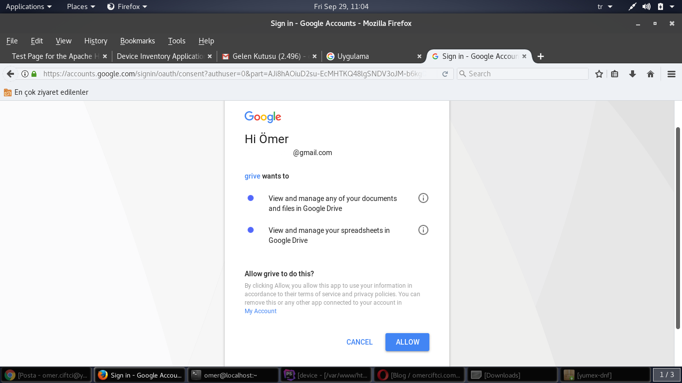 Kod çıktısında ortaya çıkan terminal linkini kopyalayarak web browserın adres satırına yapıştırarak enterlayın ve Google hesabınızda oturum açın. Grive uygulamasına “Allow” butonu ile izin vererek görebileceğiniz aktivasyon kodunuzu kopyalayın.
