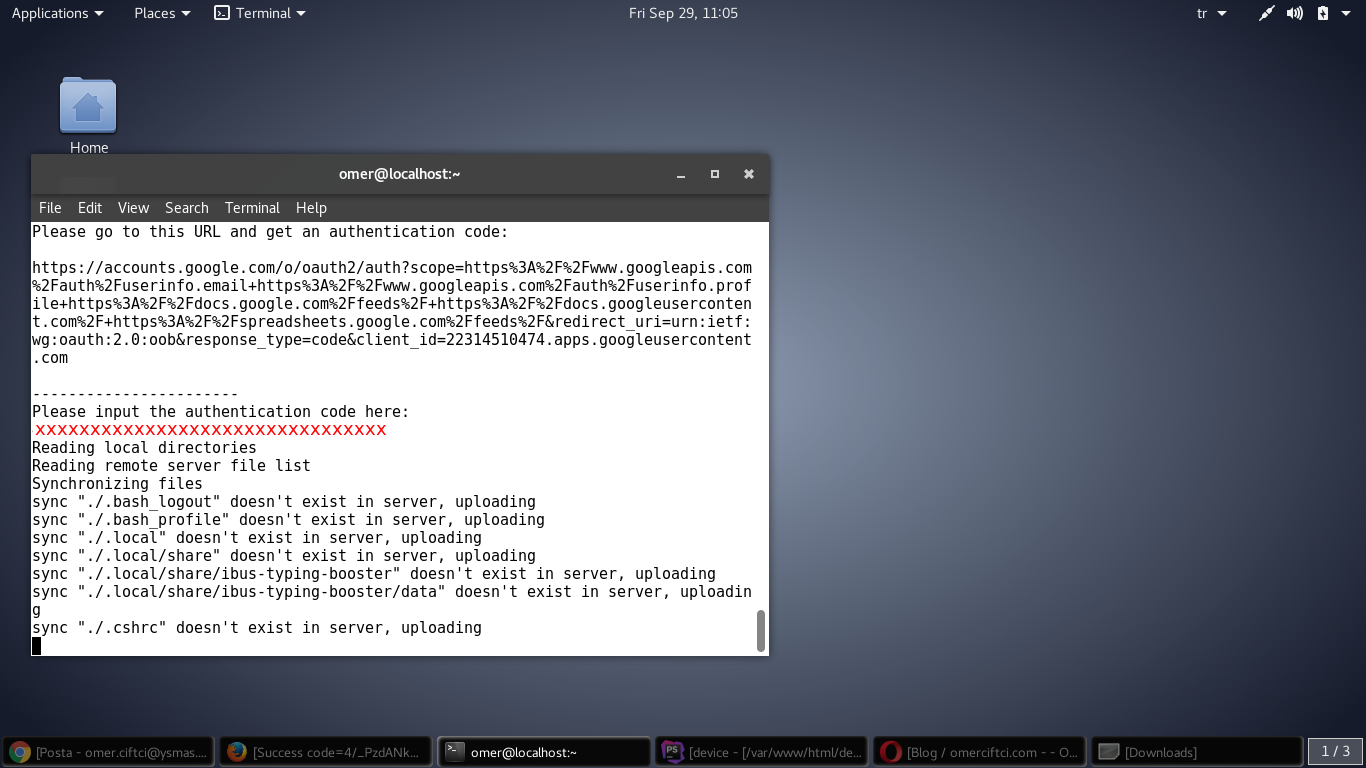Şimdi sıra Grive uygulamasını çalıştırarak Google aktivasyon kodumuzu kullanmaya geldi. Google Drive’daki belgelerimizin /root yani kök dizinine download edilmemesi ve kök dizinindeki sistem dosyalarının da Google Drive upload edilmemesi için önce terminalde cd /home/kullanıcıadiniz/ komutu ile home dizinine geliyoruz. Sonra şağıdaki komutla ilerliyoruz.