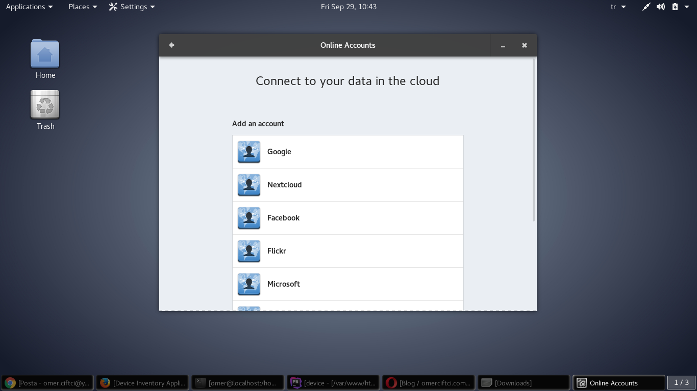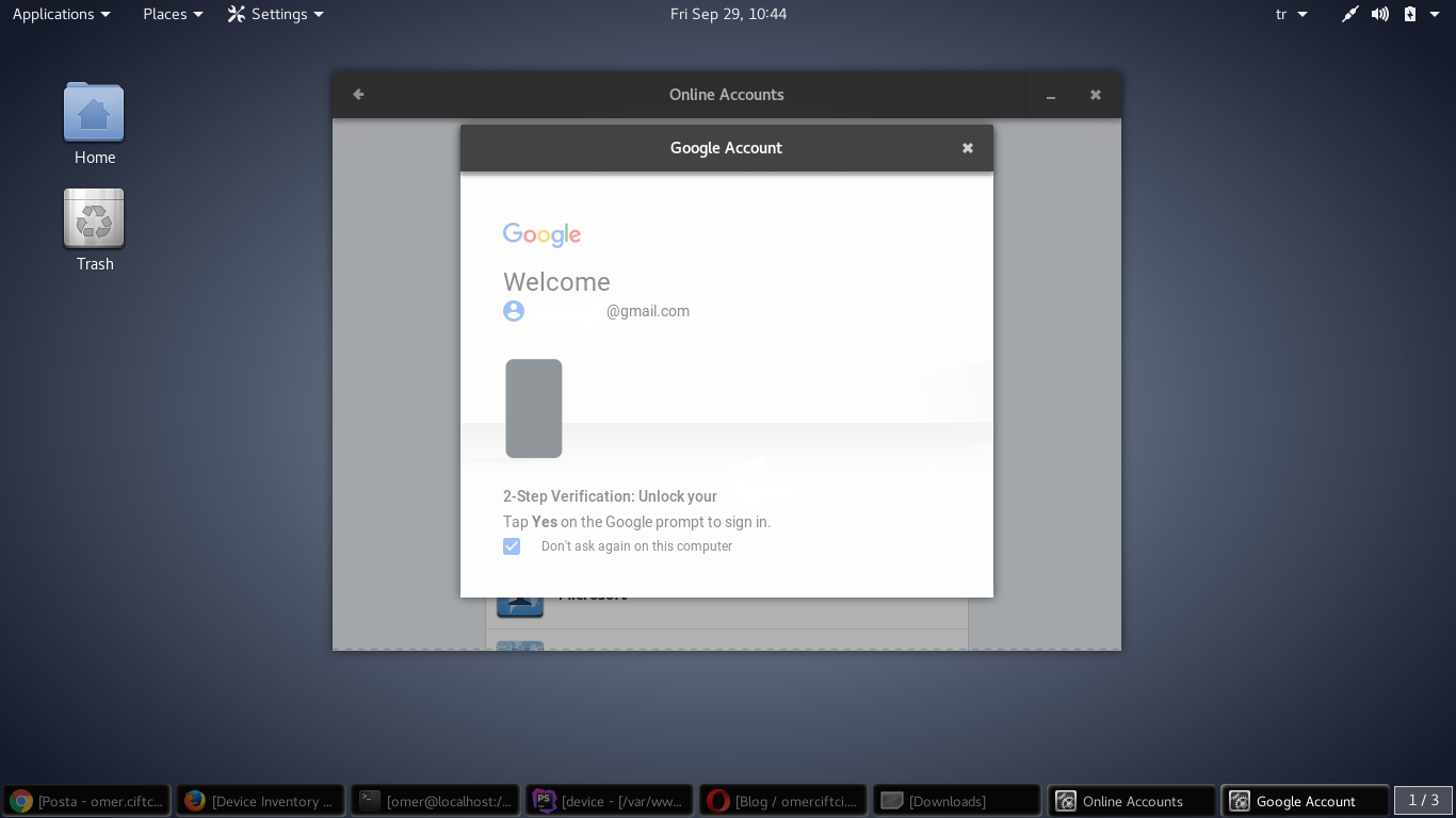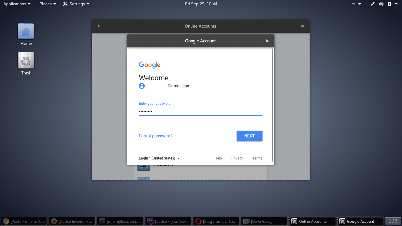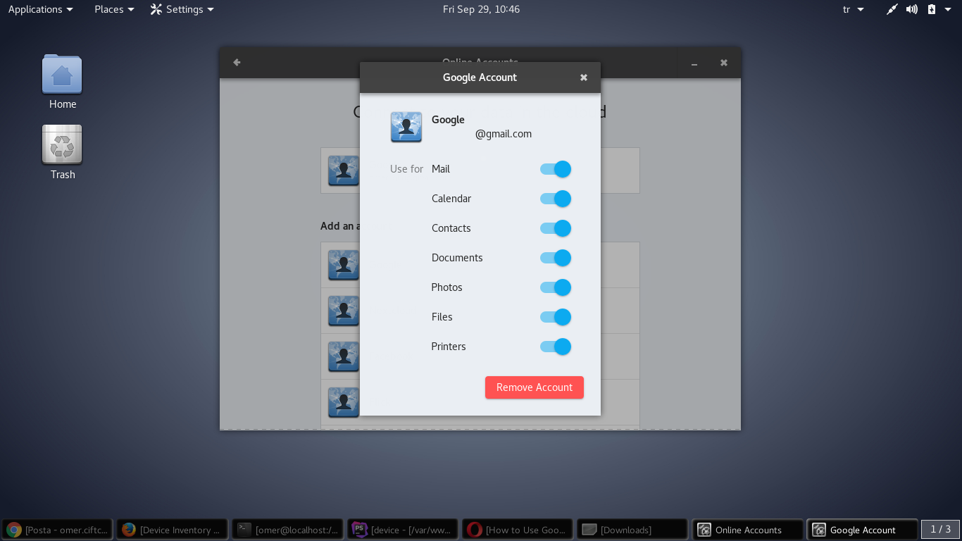 Ancak yapacağımız işlem için akıllı telefonumuza Google hesabımızı eklerken yaptığımız gibi bir uygulama şifresi oluşturmak değil bunun yerine rest api ile entegrasyon sağlandığı için aktivasyon kodu kullanmak olacak. Bu nedenle direkt olarak Google hesabımızı Gnome’a eklemiş olmamız gerekiyor. Hesabımızı ekleyelim.