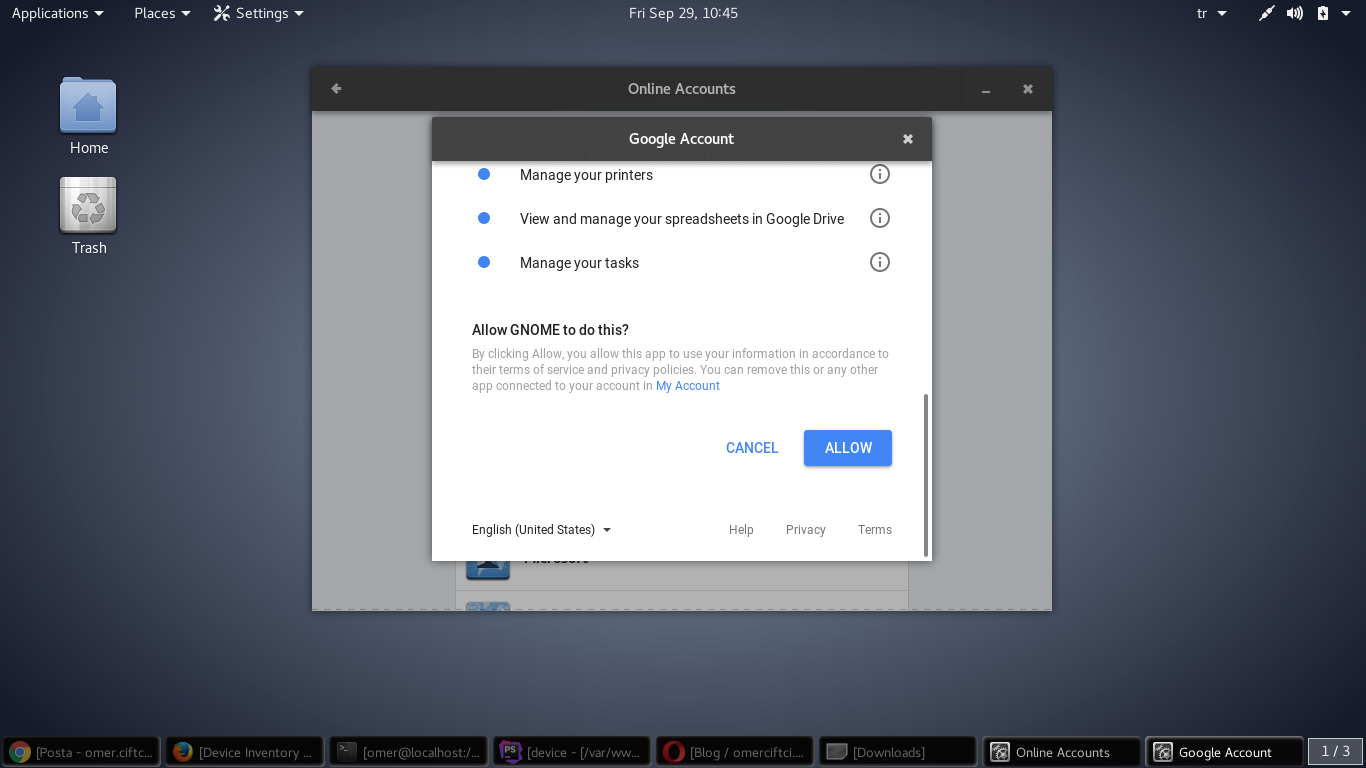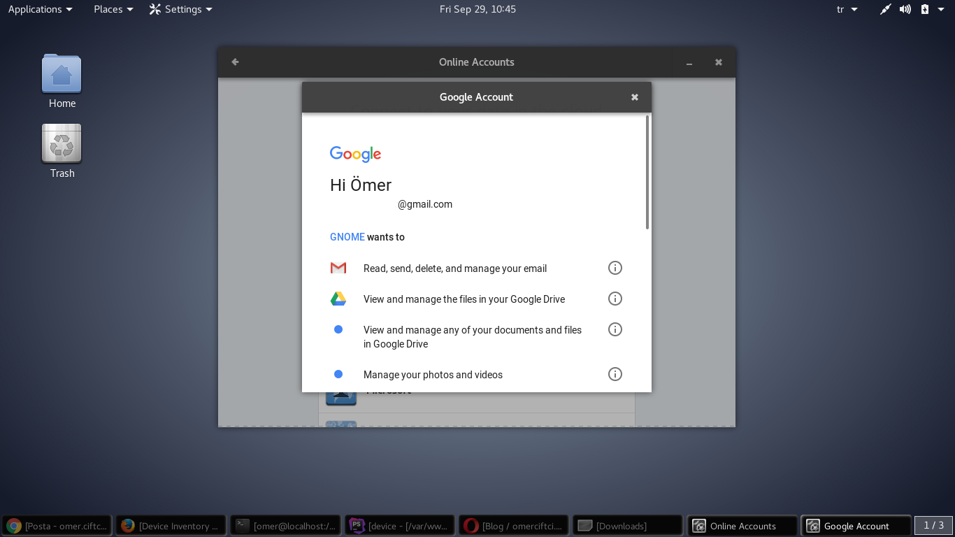 Şimdi Google hesabımıza erişim izni vermemiz gereken Gnome için hangi izinlerin söz konusu olduğunu görüyoruz.